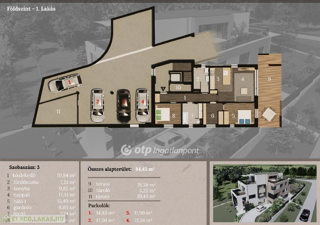 84,45 nm (nappali + 3 hálószoba, gardrób).