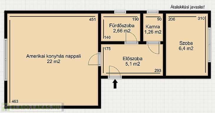 Az alaprajz minden esetben tájékoztató jellegű. Régebben ez a lakás 1,5 szobás volt. Eredeti állapota visszaalakítható (lásd alaprajz).