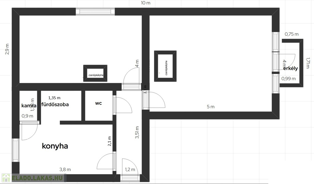 Tágas előszobából, ahol beépített szekrény is található, nyílik 2 különálló szoba, a nagyobb 20 m2, a kisebb pedig 15 m2, az előszobából nyílik a wc is, a konyha 8 m2, ahol kamra is rendelkezésre áll, a konyhából nyílik egy fürdő fülke, ülő káddal, gáz bojlerrel.
