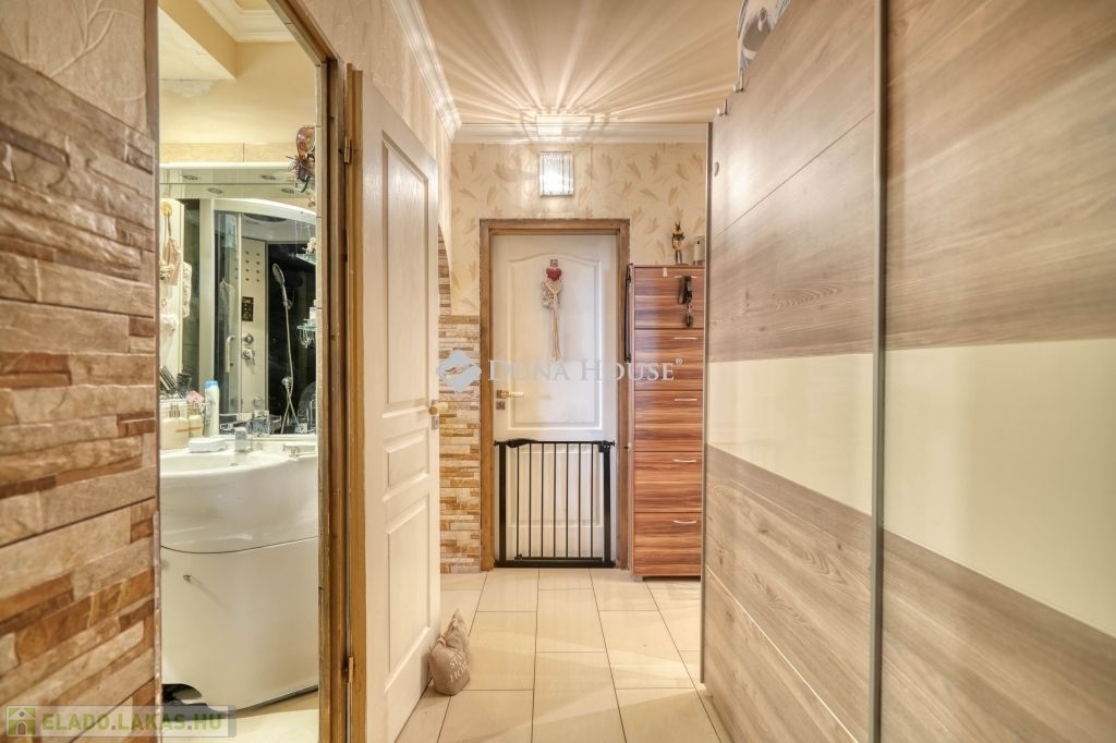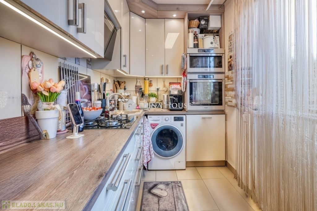 Új, beépített, gépesített konyha Whirlpool prémium háztartási gépekkel (sütő, mosogatógép, mikró, elszívó mind garanciális), teljes esztétikai és műszaki megújítás, új burkolatok, radiátorok cseréje modern, energiatakarékos típusokra, beépített loggia, beépített szekrények, villanykandalló, kamerarendszer a lakásban is kiépítve