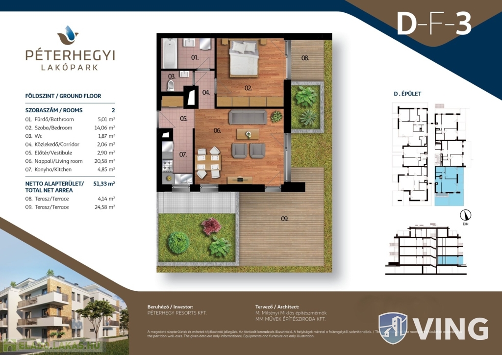 A hirdetésben szereplő lakás a D épület földszintjén található, amerikai konyhás nappali +1 hálószobás elrendezésű. Alapterülete 51,33 m2 + 31 m2 terasz.