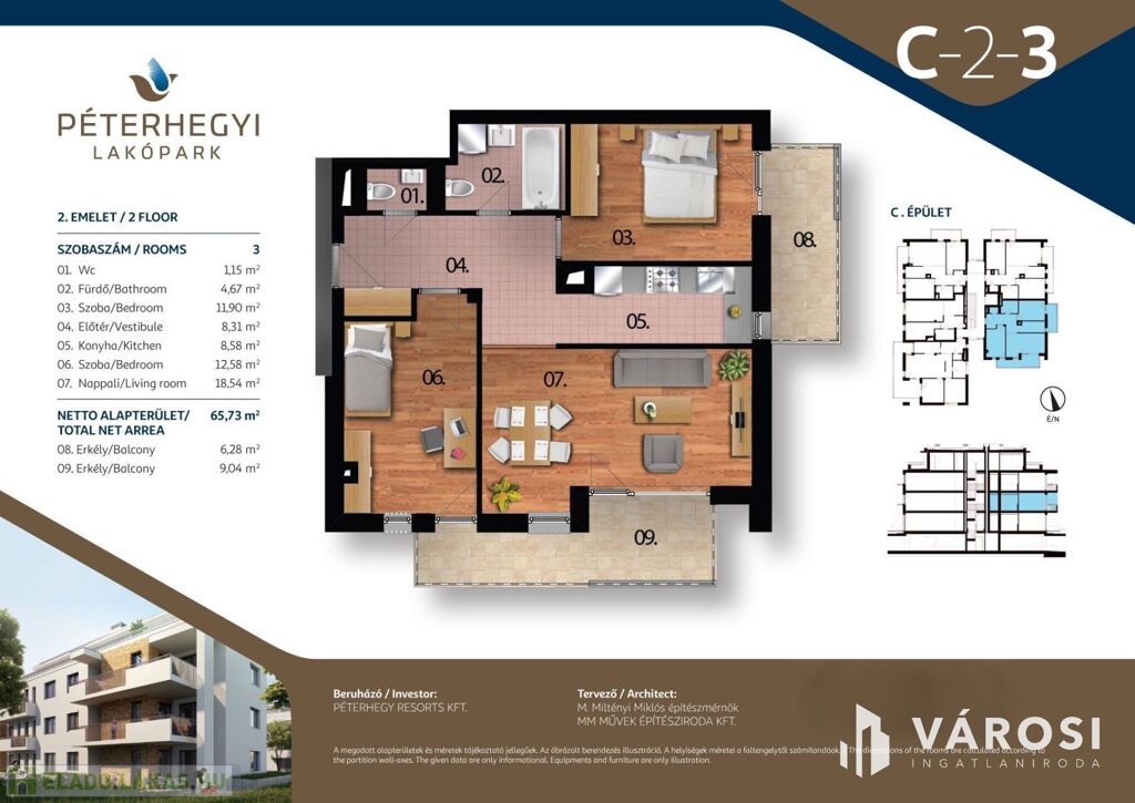Alapterülete 65,73 m2 + 15,32 m2 erkély.