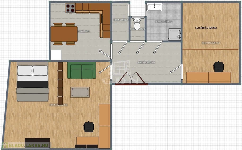A lakás teljes bútorzattal és gépesítéssel (pl. kanapé, ágy, PAX szekrény, hűtő, mosógép) is megvásárolható. A 3,80 m belmagasság, a galéria (8 m²) és az átgondolt elosztás tágas, praktikus életteret ad.