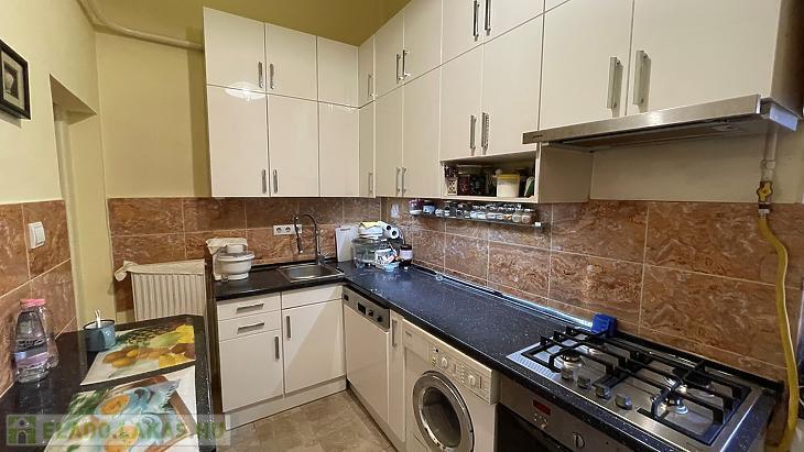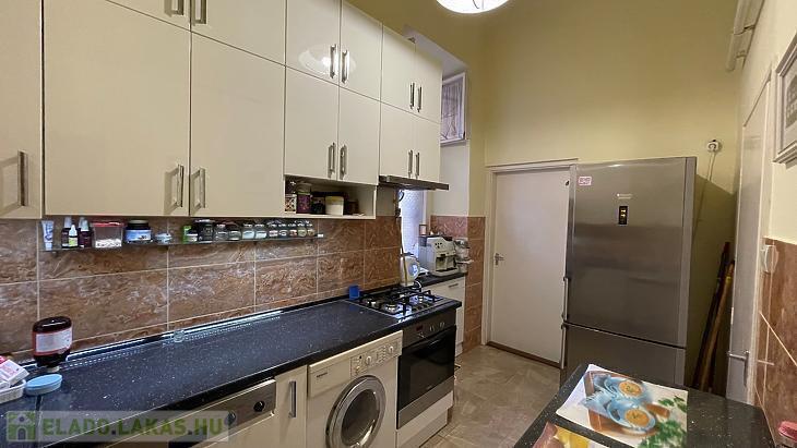 Konyhája ablakos, kényelmes méretű, és teljeskörűen gépesített.