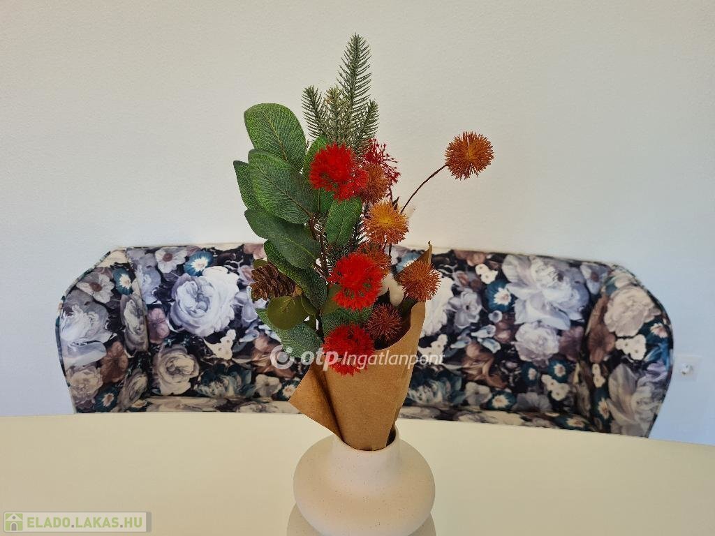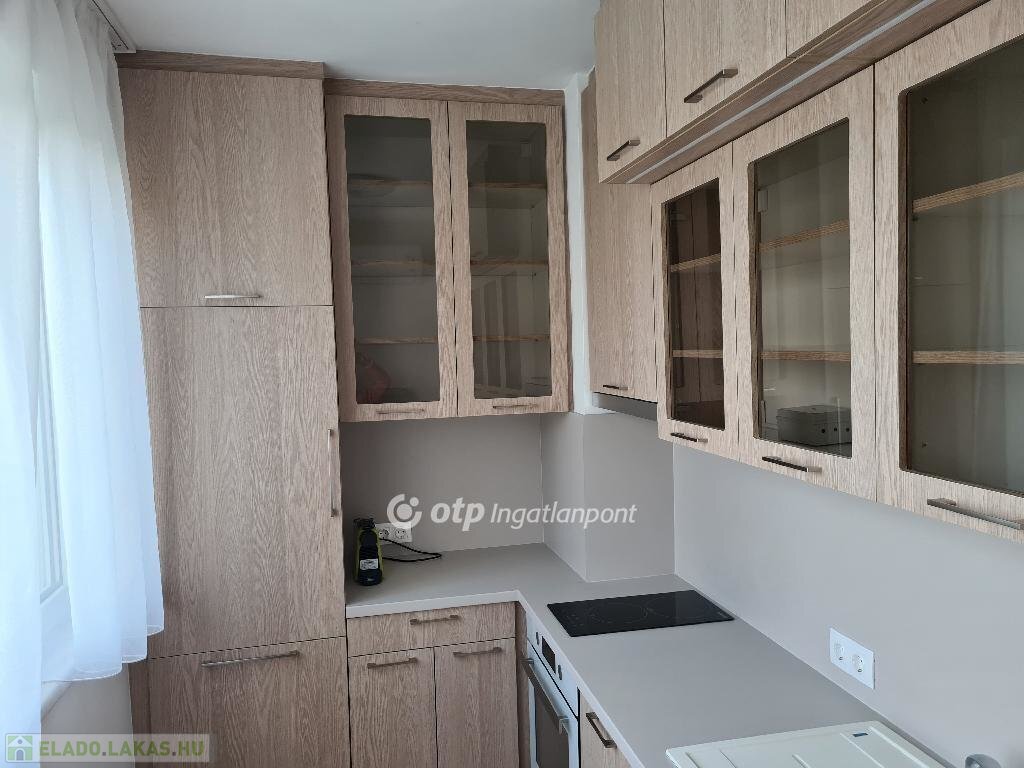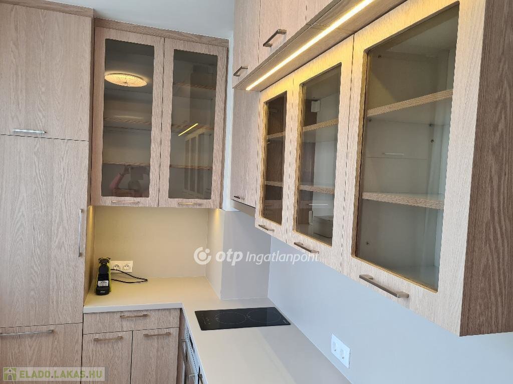 Konyha: beépített bútor, kerámia főzőlap, sütő, hűtő, mosogatógép, kapszulás kávéfőző