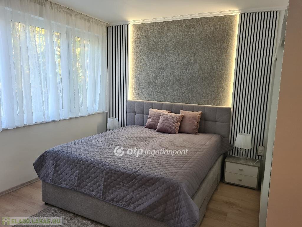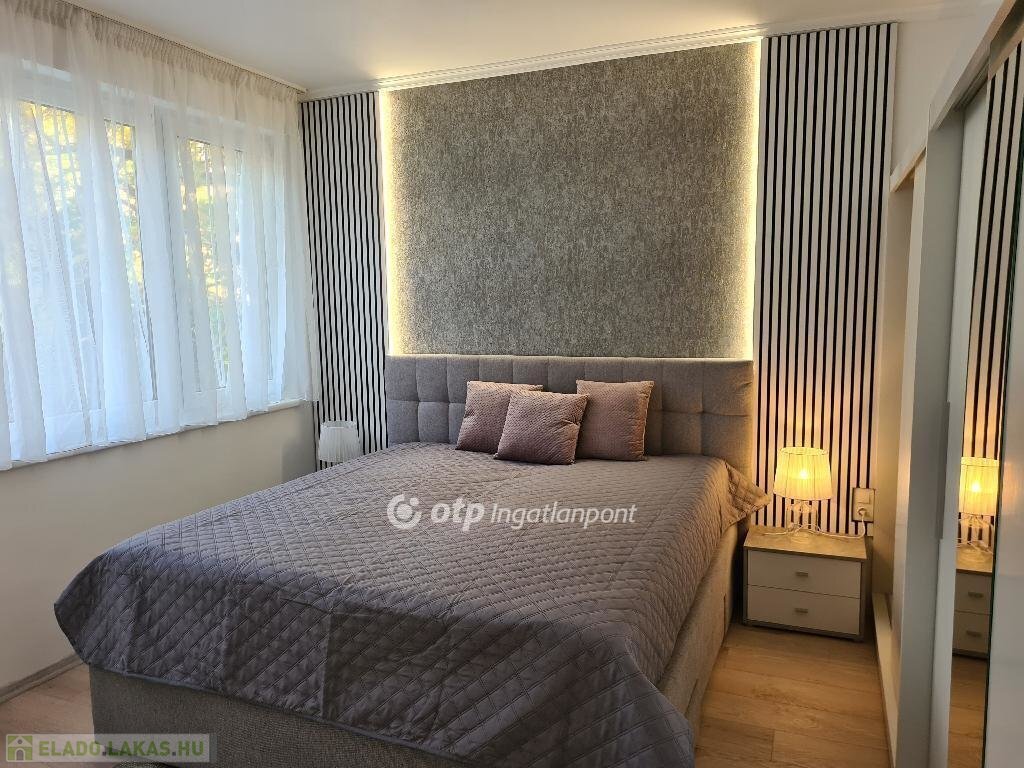 Hálószoba: ágyneműtartós franciaágy, éjjeliszekrények, gardrób és komód