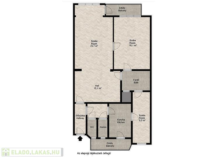 A lakás központi helysége egy 15 nm-es hall, szomszédságában találjuk a 23 nm -es, utcai nézetű, dél-keleti fekvésű, erkélykapcsolatos nappalit, a 18 nm-es hálószobát és a fürdőt.