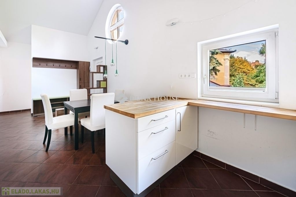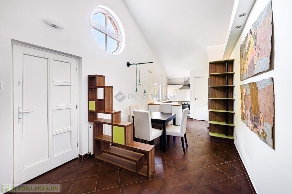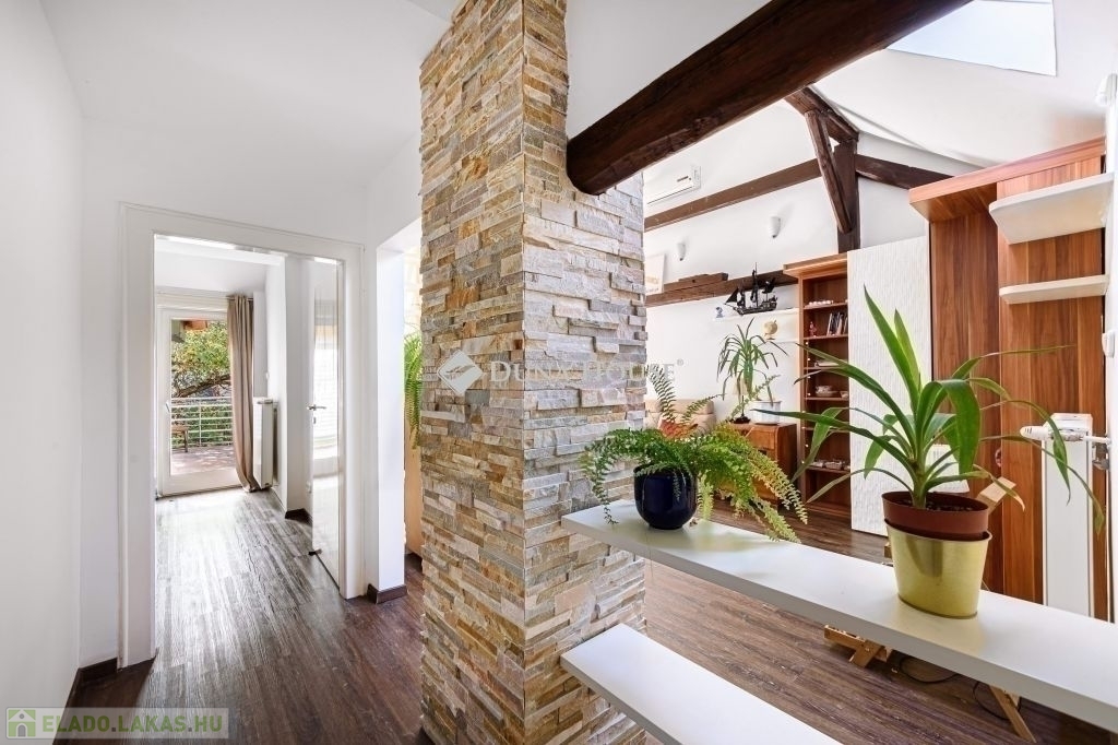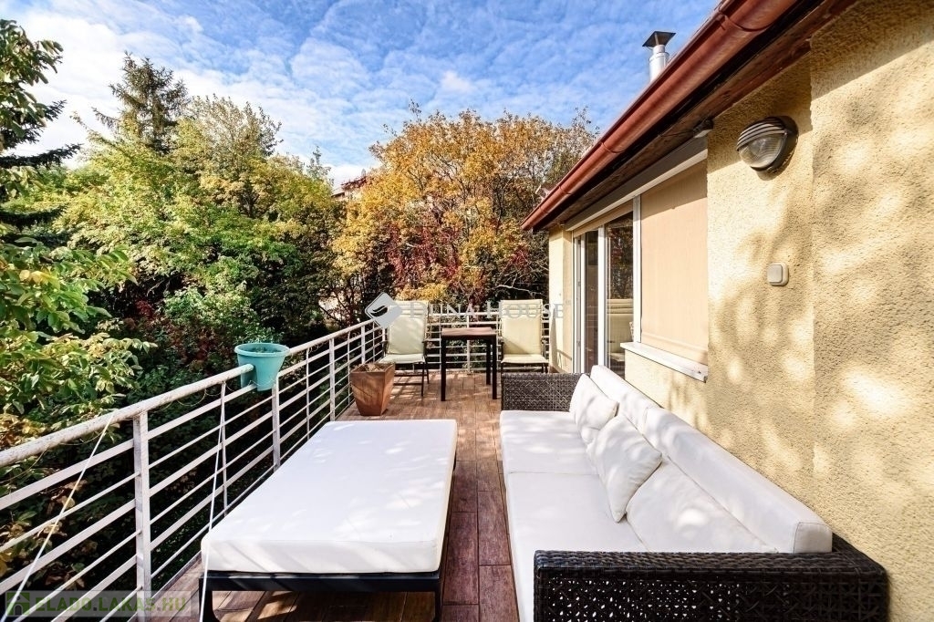 Napsütötte, tágas, teraszos otthon - KissvábhegyenBudapest egyik legkedveltebb, zöldövezeti részén, a XII. kerület Kissvábhegyén, az Ügyész utcában kínálunk megvételre egy különleges hangulatú, 80 m²-es, belső kétszintes lakást, 12 m²-es, napfényben fürdőző, kertre néző saját terasszal.A lakás egy elegáns, háromlakásos villaépület legfelső szintjén helyezkedik el, így teljes intimitást és nyugalmat biztosít tulajdonosának.A lakás különlegességei:- Lélegzetelállító terek és fényár a 4 méteres belmagasság, valamint a rusztikus, látszó gerendás nappali egyedi karaktert kölcsönöz az otthonnak.- Kivételes tárolókapacitás ízlésesen beépített szekrények és tágas gardrób biztosítanak rendszerezett életteret.- Csendes, zöld környezet, mégis kiváló közlekedés a belváros mindössze percek alatt elérhető. (Busz: 21, 39, 102, 210, 212 Villamos: 17, 59, 61 M2 metró: 10 perc séta)A lakás elrendezése:- elegáns előszoba- konyha-étkező + kamra- tágas nappali rusztikus látszógerendákkal, közvetlen teraszkapcsolattal- kényelmes méretű hálószoba, szintén kijárattal a teraszra- stílusos fürdőszoba zuhanykabinnal és WC-el- a galériaszinten egy nyitott, világos dolgozó- vagy vendégszoba, beépített gardrób és extra tárolófelületekA lakás a villa felső szintjén, kb. másfél emelet magasságban található. A hozzá vezető zárható, kizárólagos használatú lépcsőház további biztonságot és extra tárolási lehetőséget kínál.A lakás teljes körű felújításon esett át, és azóta is gondosan karbantartott.Cirkófűtés és klímaberendezés gondoskodik az évszakokhoz illő kényelemről.Külső adottságok:A villa egy 1070 m²-es, ősfás, parkosított telken helyezkedik el. A lakáshoz saját kerthasználat tartozik, ahol homokozó-játszórész, grillterasz, pihenőkert vagy veteményes is kialakítható.A kényelmet saját udvari gépkocsibeálló és külön külső tároló is szolgálja, melyek árát a vételár tartalmazza!!!Ez az ingatlan tökéletes választás azoknak, akik egy napfényes, hangulatos, otthonos lakást keresnek a XII. kerület egyik legjobb részén, ahol a zöld környezet és a városi kényelem találkozik.Ha Ön is egy egyedi atmoszférájú, magas minőségű lakásra vágyik Budapest egyik legkívánatosabb részén, keressen bizalommal a részletekért és a megtekintés egyeztetéséhez!