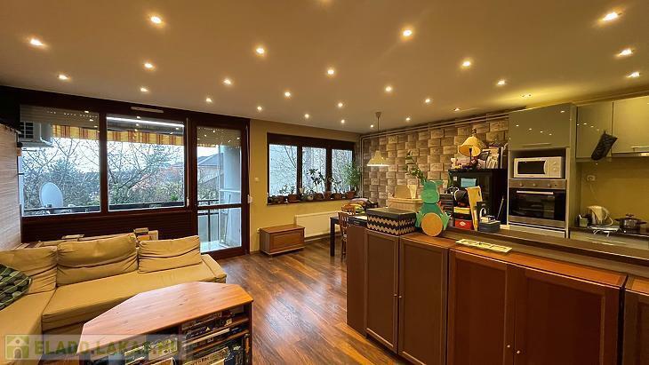 A lakás központi része a tágas, nagy üvegfelülettel rendelkező, dk-i fekvésű, erkélykapcsolatos, szép kilátással rendelkező amerikai konyhás nappali.