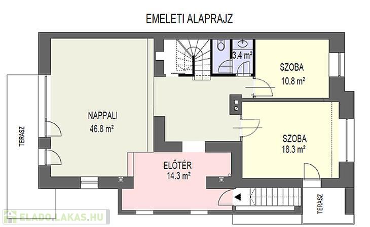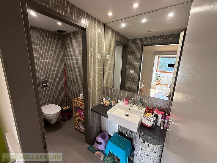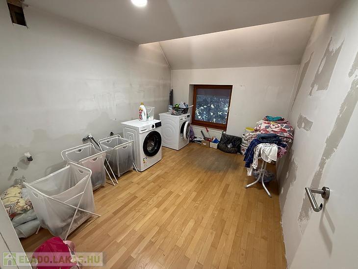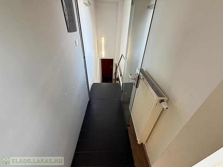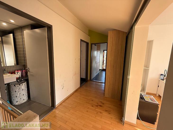 A szigetelt ház 2 lakásos, 3 szintes, amelyből az eladásra kínált lakás a felső két szinten helyezkedik el. A lakás 6 szobával rendelkezik, amelyből az első emeleten található egy nappali + 2 szoba, a többi szoba a második emeleten helyezkedik el.