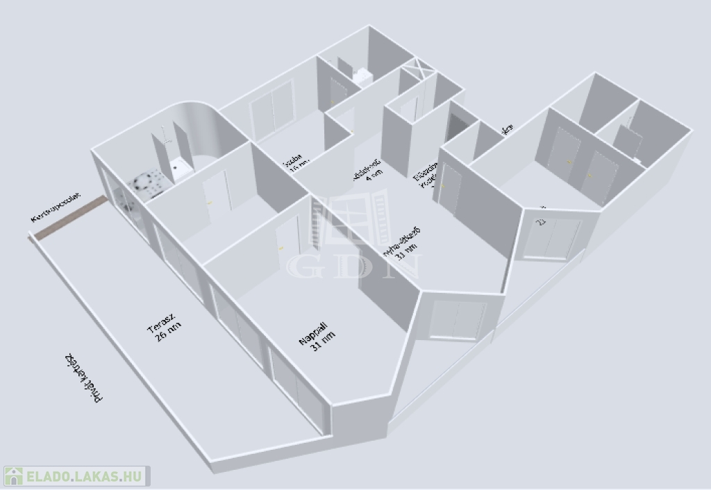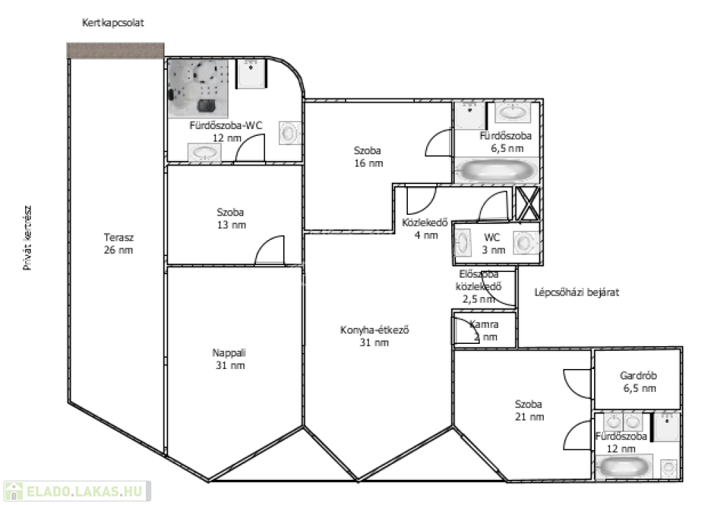 - kertkapcsolatos nagyméretű terasz: 35 m2,