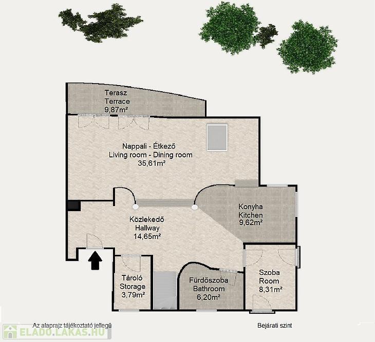 A bejárati szinten egy tágas, panorámás, kényelmes méretű terasszal rendelkező nappali, egy ugyancsak panorámás, szeparált konyha, egy franciaerkéllyel rendelkező hálószoba, egy zuhanyzós fürdőszoba, tároló és egy előszoba található.