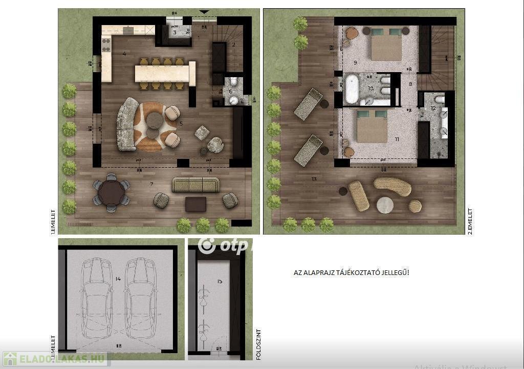 A 167 m2-es, 3 lakás belső kétszintes, kívülről közvetlenül és a kétállásos garázs felől is megközelíthető. Az előtérből a tágas nappali-étkező-konyha részbe lépünk. A nappali teljes frontján, illetve az étkező felőli oldalán is megközelíthető a 48 m2-es tágas terasz. A felső szinten további 2 hálószoba található, mindegyiknek saját fürdője van és mindkét hálóból megközelíthető a 63,8 m2-es terasz.