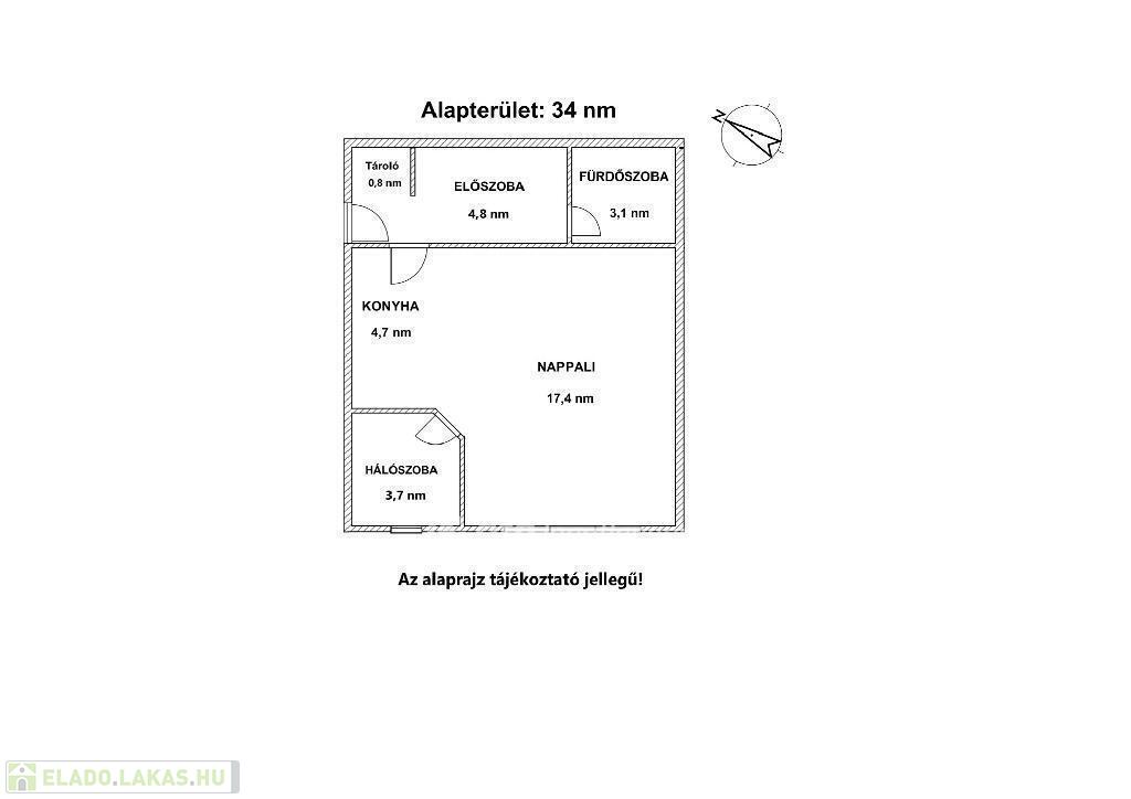 Nappali, egy félszoba, nappalival egybe nyitott konyha, előszoba, tároló és fürdőszoba áll rendelkezésre.