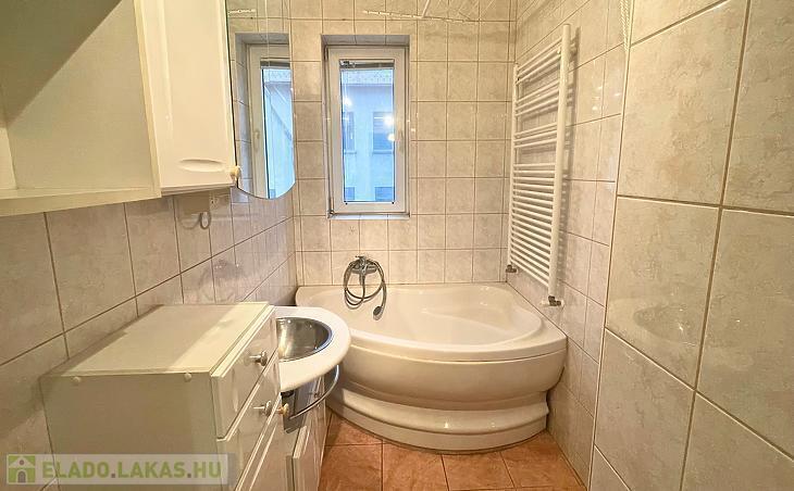 Konyhája világos, ideális méretű. Szomszédságában találjuk az ablakos, sarokkáddal szerelt fürdőszobát. A külön wc-t az előszobából közelíthetjük meg.