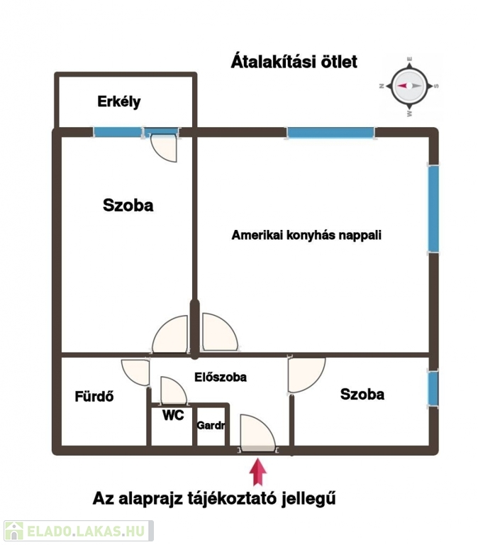 Az ingatlan jelenlegi elosztása: nappali + 1 hálószoba, de kis átalakítással nappali + 2 hálós otthonná alakítható, így ideális lehet kisebb családnak vagy akár befektetésnek is.