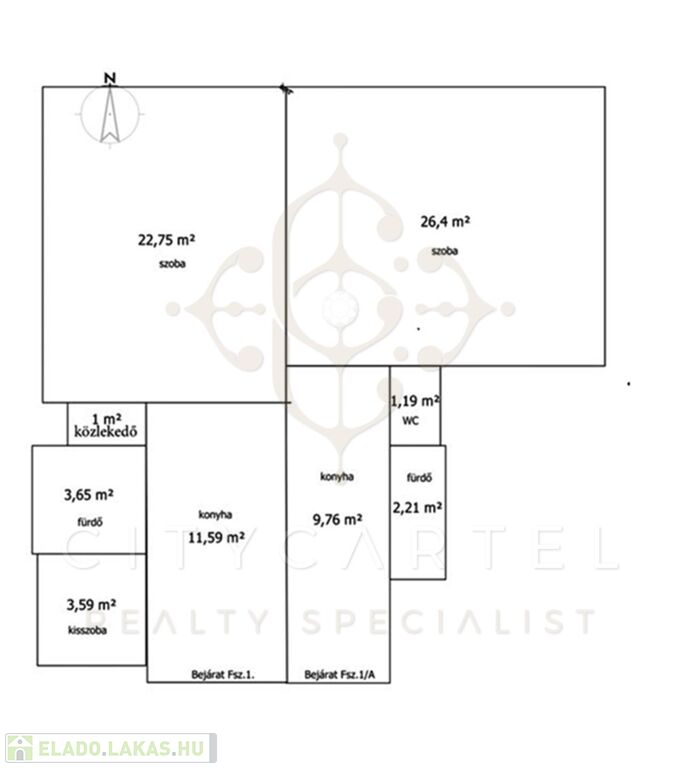 A bejáraton belépve a konyhába érkezünk, ahonnan balra található a kisszoba (3,5 nm) és a fürdőszoba, míg szemben a tágas nagyszoba (23 nm) kapott helyet.