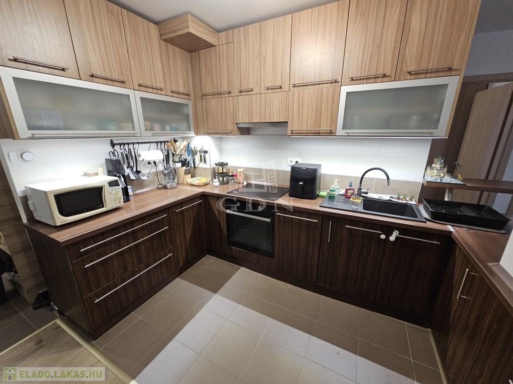 beépített, gépesített konyha (sütő, főzőlap, mosogatógép)