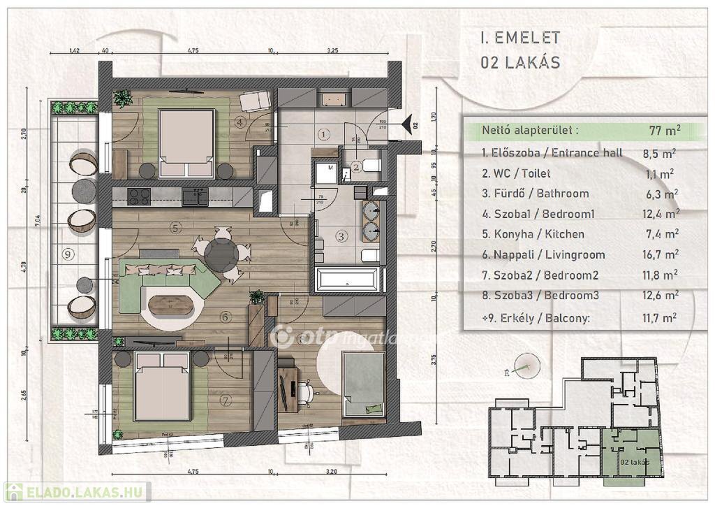 Az ingatlan egyedi ízlés szerint alakítható, szabadon választhatók a szaniterek, hideg/meleg burkolatok, beltéri ajtók.