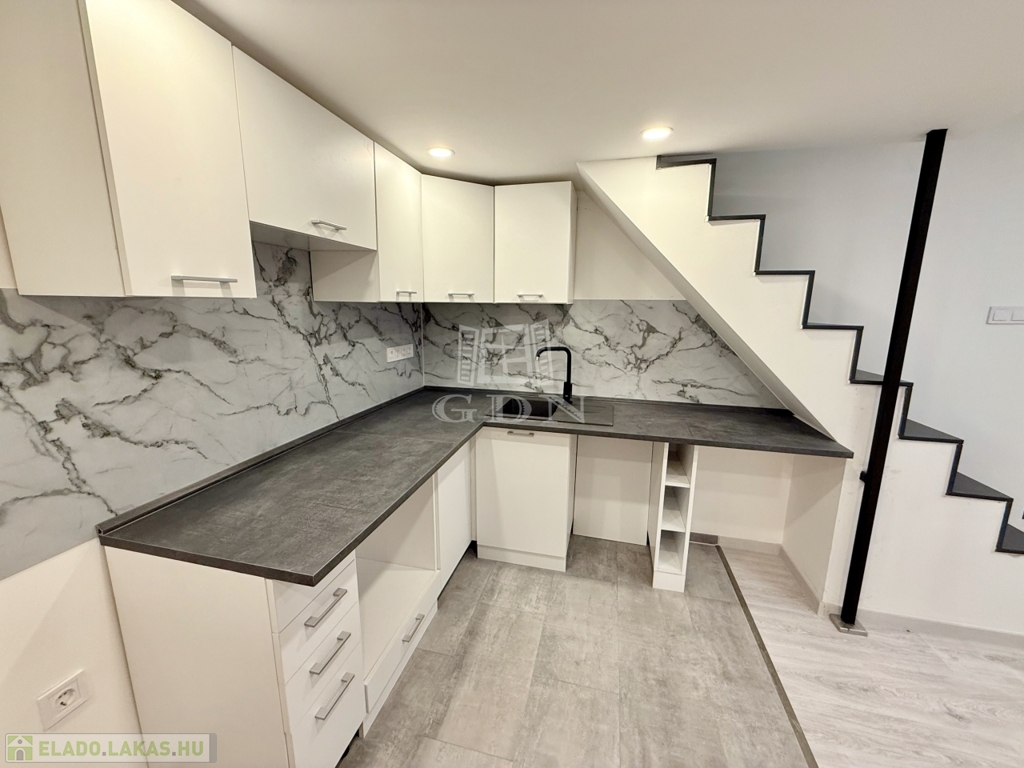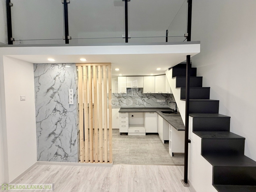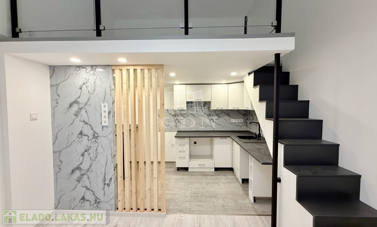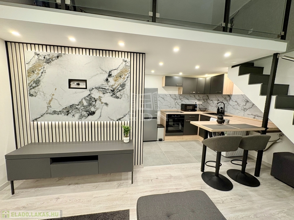 • „A” lakás: 27 m² + 9 m² galéria, elkészült konyhabútorral, gépészetkész állapotban.