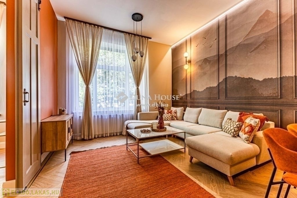 XIII. kerület Újlipótvárosi részén, a pezsgő Belváros szomszédságában pár perc sétára Westendtől, eladó egy nagypolgári lakás. A lakás tulajdoni lap szerint 92 nm melyet két lakássá bontottak, ennek eredmény keppen, egy közel 75 nm, és egy 18 nm alapterületű lakás került kialakításra. Jelen hirdetésben szereplő 75 nm lakrészt kínáljuk eladásra.A lakást, a mostani tulajdonos az alapokig visszabontotta, és minden elemében megújította. Ennek köszönhetően, két hálószoba és tágas nappali került kialakításra.A terekre jellemző, hogy a mind a fő mind a második hálószoba is közel 15 nm; a fő hálószobából leválasztottak egy Gardrobe helyiséget. A nappali tágas világos, magában foglalja az étkezőt is, a konyha a tágas közlekedő részen kapott helyet, ahonnan a Fürdő és az udvari tájolású hálószoba is megközelíthető.A felújítás során magas minőségű anyagok kerültek beépítésre, mind a szaniterek, mind a nyílászárók tükrözik azt az igényességet, amelyet a Home Staging során kiválasztott bútorok és berendezési tárgyak egészítenek ki és teszik harmonikus otthonná. A lakás teljes bútorzattal, és berendezési tárgyakkal együtt megvásárolható.A házban a rövidtávú kiadást mostani tudásunk szerint a ház nem engedélyezi, a kisebbik lakrész jelen pillanatban is ki van adva hosszú távra. Igény esetén az is megvásárolható, külön megállapodás alapján.Jöjjön el nézze meg.