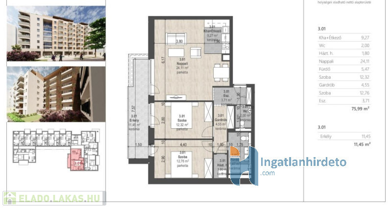 Elhelyezkedése: Társasház Emeleti elhelyezkedés: Emeleten Emelet száma: 3 Épület emeleteinek száma: 7 Tájolása: Déli tájolású Állapota: új Komfort besorolása: összkomfortos Építési éve: 2027 Alapterülete: 76 m2 Szobák száma: 3szoba Közművek: Víz, Villany, Csatorna Fűtés típusa: Padlófűtés, Fan-coil, Hőszivattyú Homlokzat állapot: új Építési mód: Tégla Parkolási lehetőség: Garázsban Kilátás: Udvari kilátás Napelem: Nincs Jellemzői: Alacsony rezsi, Csendes környék, Jó közlekedés Energetikai besorolás: A+ Egyéb jellemzők: Erkély, Lift Tv, Internet: Kábeltévé, Internet Terhelések: Tehermentes ingatlan Eladásra vonatkozó információk: Kizárólag magánszemélyek jelentkezését várjuk