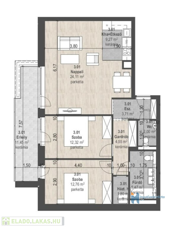 - fűtése: levegős hőszivattyús rendszer (padlófűtés, Fan-coil hűtés)