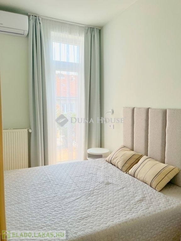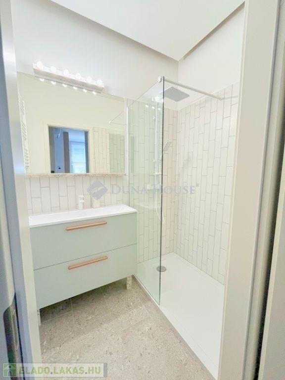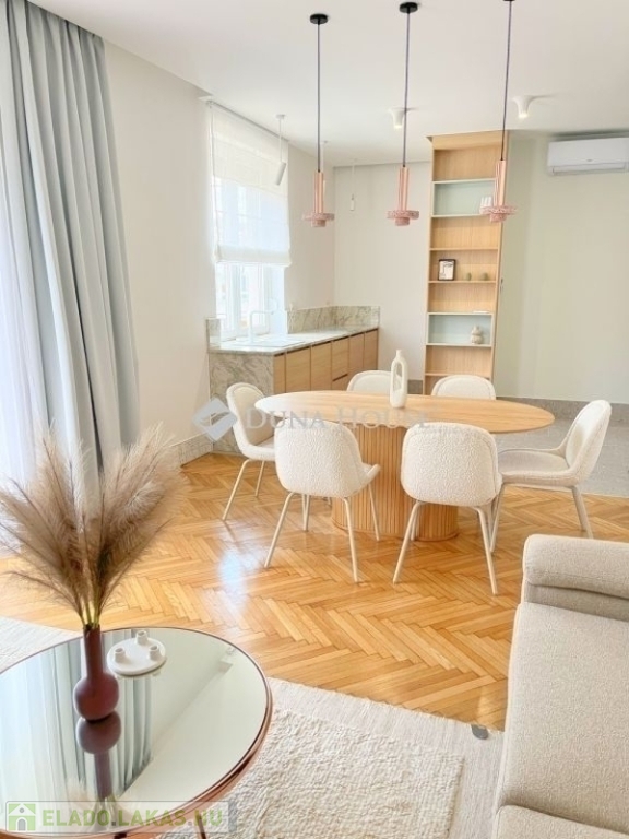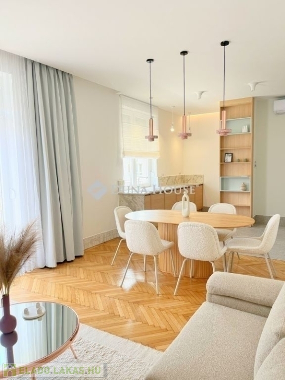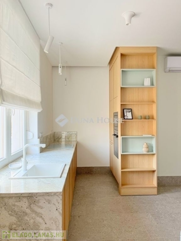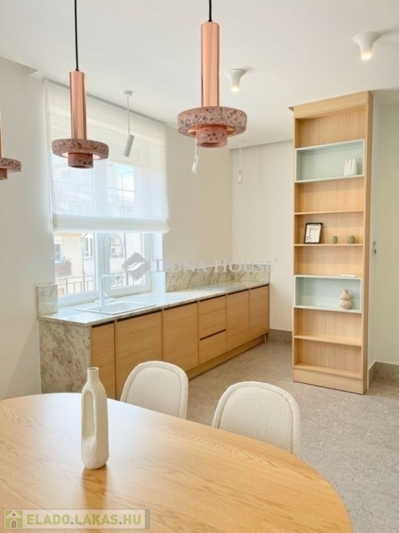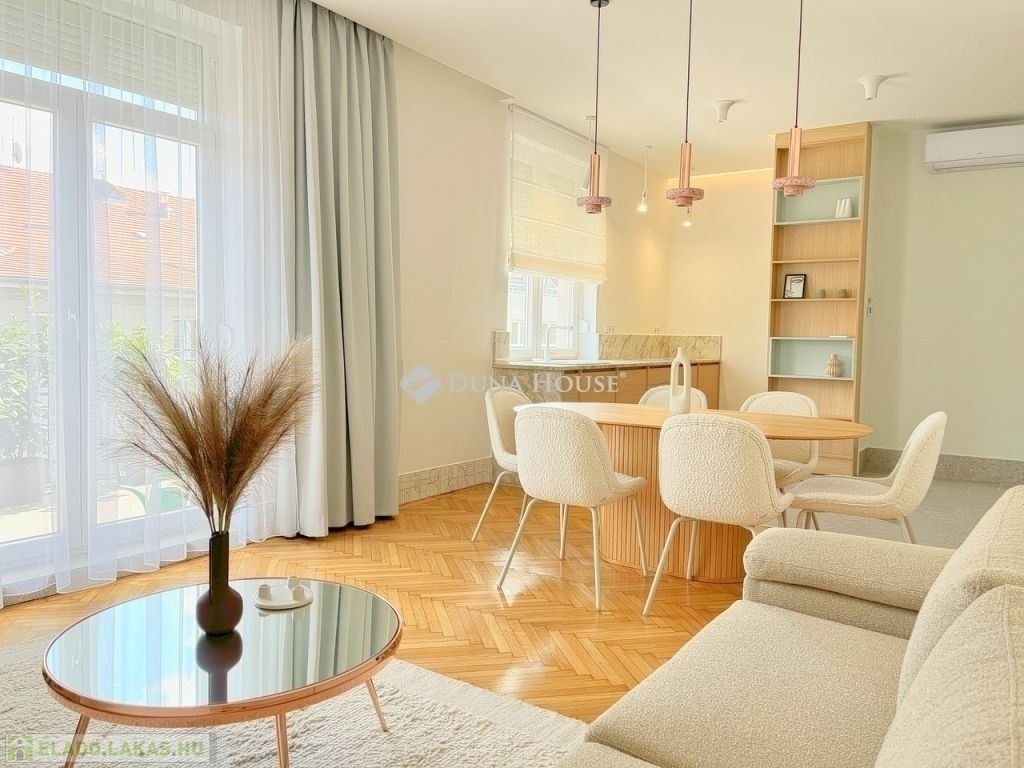 Újlipótvárosban, a Raoul Wallenberg utcában eladó egy 2024-ben teljeskörűen felújított, hatodik emeleti, 67 m²-es lakás 24 m²-es tetőterasszal a Phönix-házban.A lakás belsőépítész tervei alapján került felújításra és átalakításra. A nappali és a konyha-étkező egy tágas légtérben található, dupla erkélyajtóval a teraszra. A hálószobából szintén van kijárat a teraszra. Külön vendég WC helyiség került kialakításra.Az ingatlan főbb jellemzői: 24 m²-es, dél-keleti fekvésű tetőterasz panorámával; légkondicionálás a nappaliban és a hálószobában; egyedi beépített bútorok; BOSCH konyhai gépek (sütő, főzőlap, beépített mikró, mosogatógép, hűtő fagyasztóval); eredeti fa parketta; magas minőségű burkolatok; felújított és szigetelt tetőterasz; redőnyök; biztonsági bejárati ajtó; padlófűtés a hidegburkolatos helyiségekben.A társasház jó anyagi körülmények között van, jelenleg is folyamatban van a teljes elektromos hálózat felújítása. A lépcsőház és a lift korábban felújításra került.Az ár a teljes berendezést, bútorzatot és a gépeket tartalmazza.