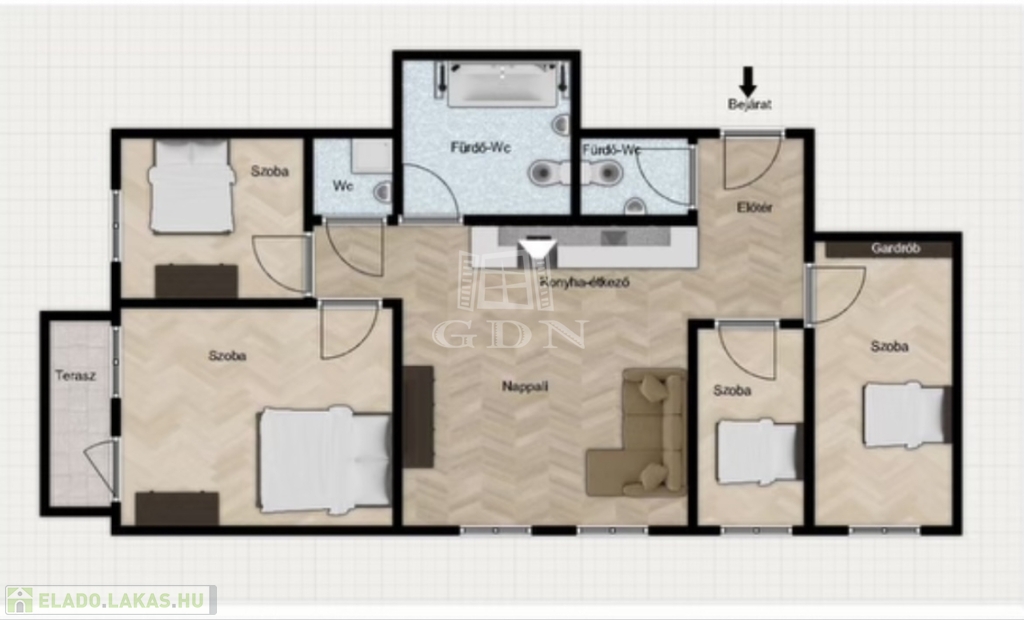 Az ingatlan rendelkezik 4 hálószobával, 2 fürdőszobával + wc-vel és vendég wc-vel.