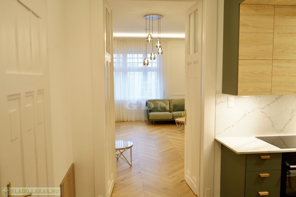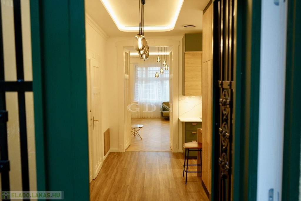 A 3,2 méteres belmagasság, a klasszikus halszálkamintás tölgyfa parketta és a felújított, patinás beltéri ajtók időtálló nagypolgári hangulatot teremtenek, amely harmonikusan kapcsolódik a modern megoldásokhoz. Az enteriőr kifinomultságát designlámpák és gondosan kiválasztott burkolatok erősítik, egységes és elegáns összképet alkotva.