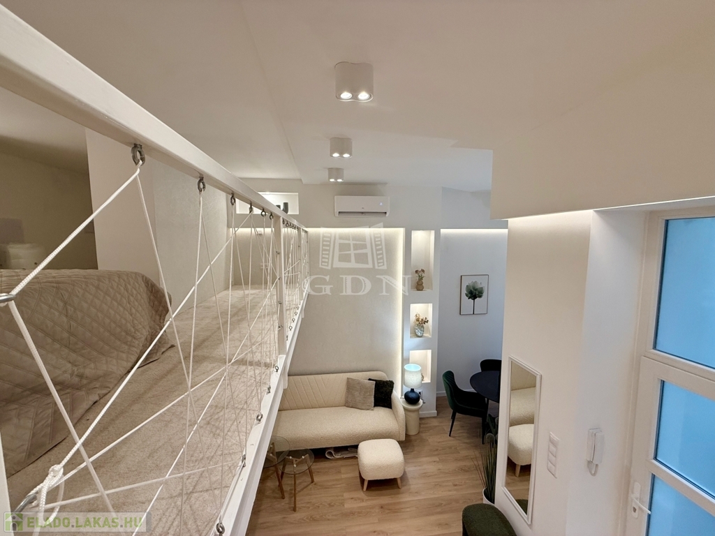 A koncepció lényege az élhető tér kis alapterületen. A megfelelő belmagasság lehetővé tette a galériás kialakítást, így a nappali és hálófunkció elkülönül, ami érezhetően javítja a használhatóságot és a kiadhatóságot. Az anyaghasználat, a burkolatok és a gépészet nem kompromisszumos megoldások: tartós, időtálló, karbantartható elemek kerültek beépítésre.