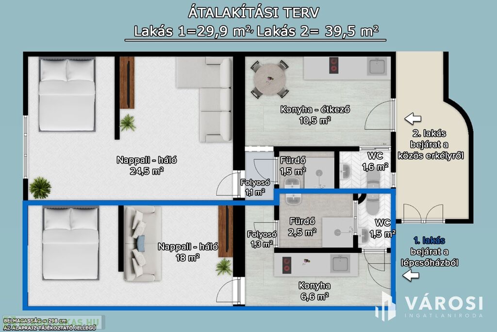 Lakótér: 70 m², elrendezése: 1 nappali, 1 hálószoba, konyha, külön fürdő és WC, kamra, 2 bejárat.