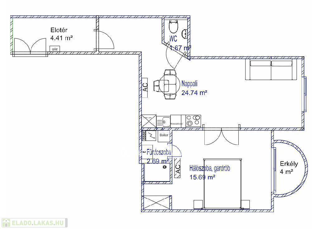 Egy nappalival, egy hálószobával, fürdőszobával, gardrób szovábal és külön wc-vel került kialakításra.