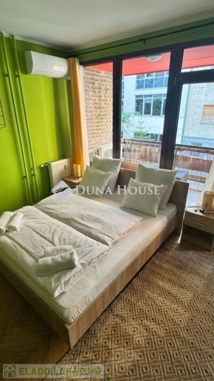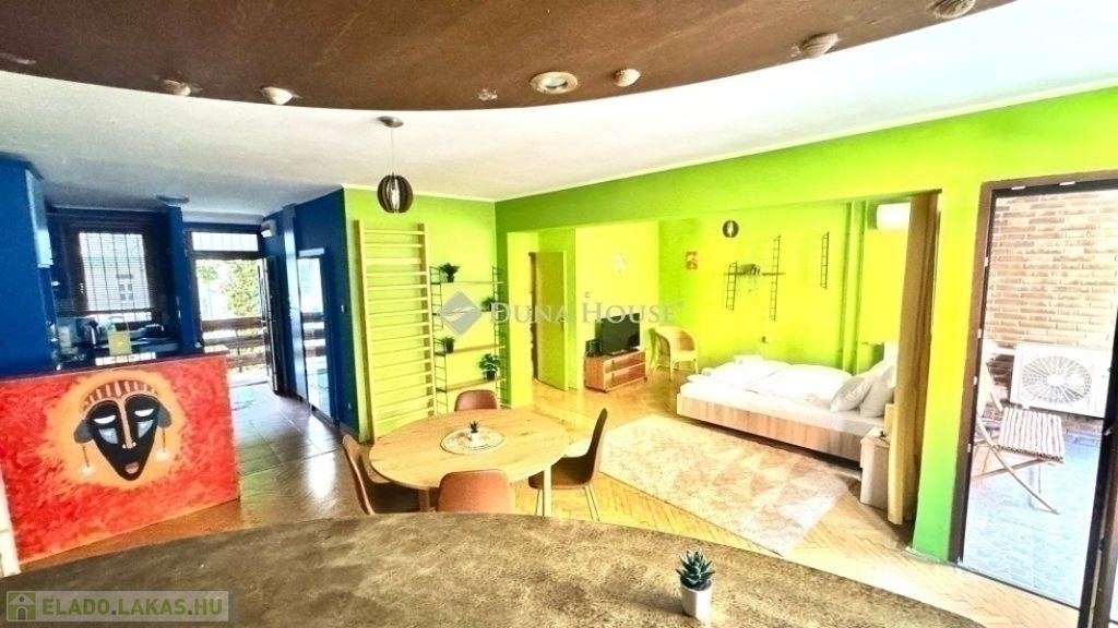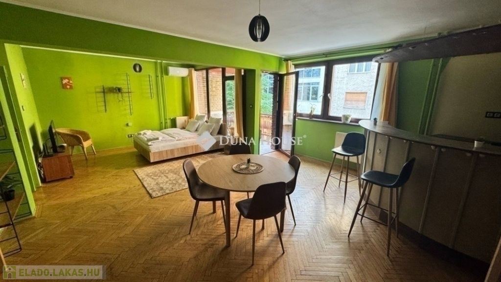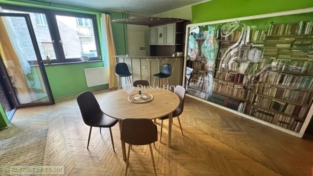 egy 63m2-es, déli fekvésű, nagyrészt csendes közre néző, napfényben úszó, tágas terekkel rendelkező, 1. emeleti lakás. 2017-ben volt felújítva, ekkor ki lettek cserélve a külső nyílászárók, és teljes villanyvezeték rendszer. Egy festés, és némi esztétikai felújítás után költözhető állapotú. Jelenlegi beosztását tekintve, egy nagy nappalival és egy hálóval rendelkezik, de könnyedén kialakítható még egy háló, ahogy eredetileg volt. Akár rendelőnek vagy irodának is kifejezetten alkalmas.