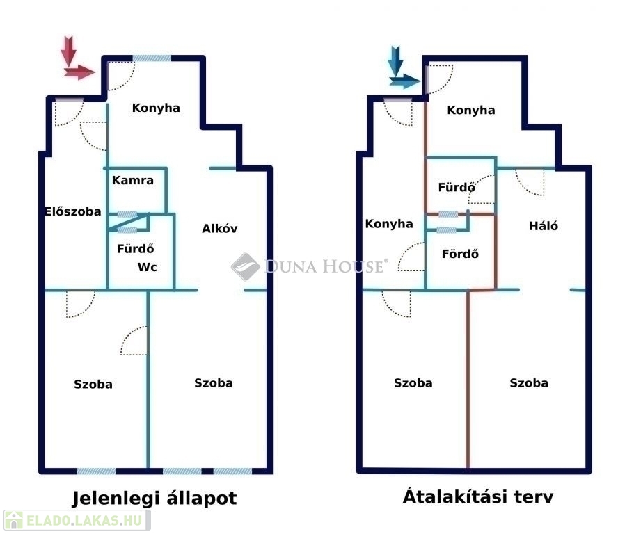 A konyha áthelyezésével akár 3 szobássá is alakítható, de mivel két bejárattal rendelkezik, akár két kis lakássá is bontható.