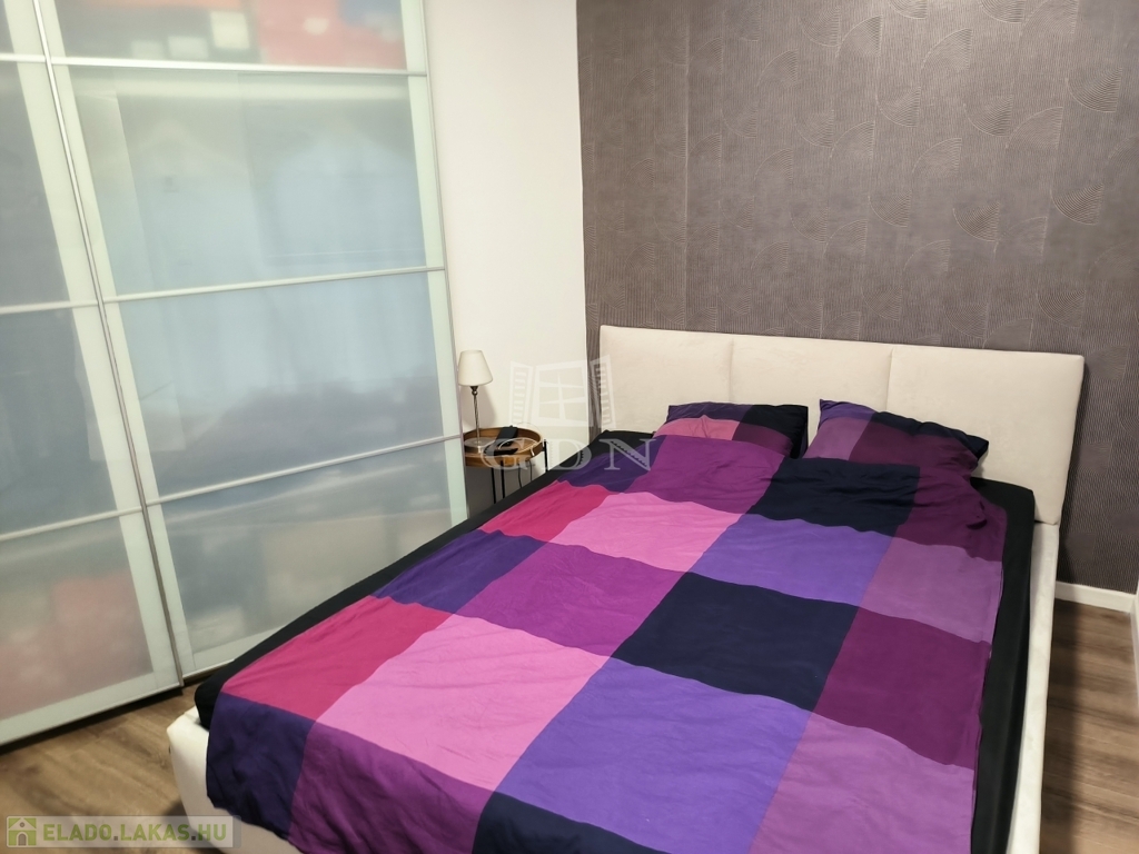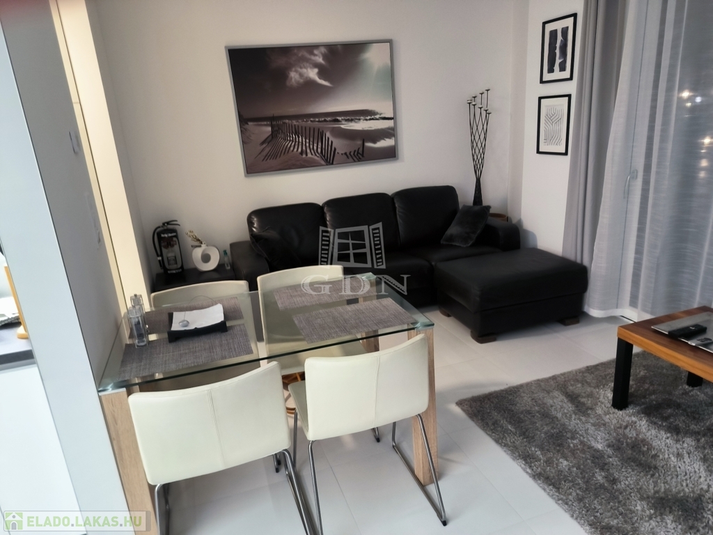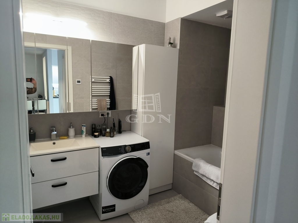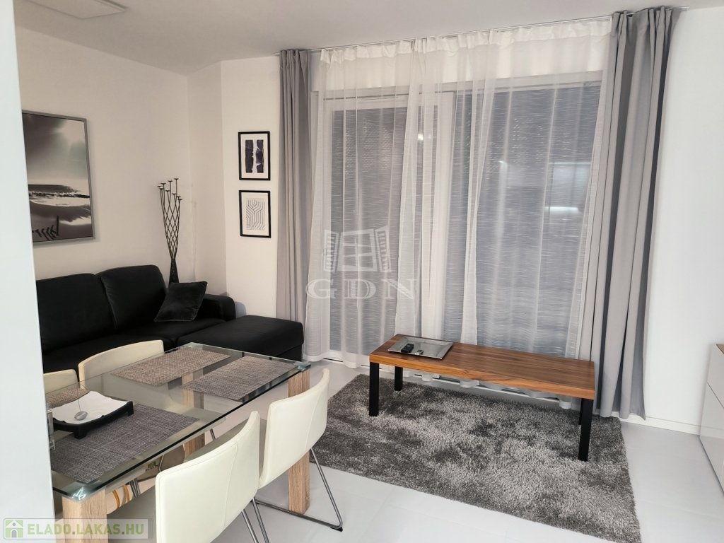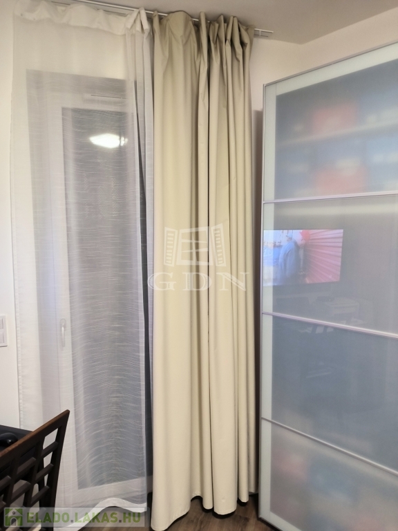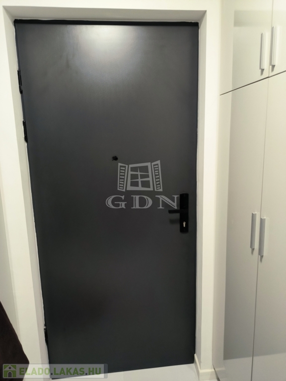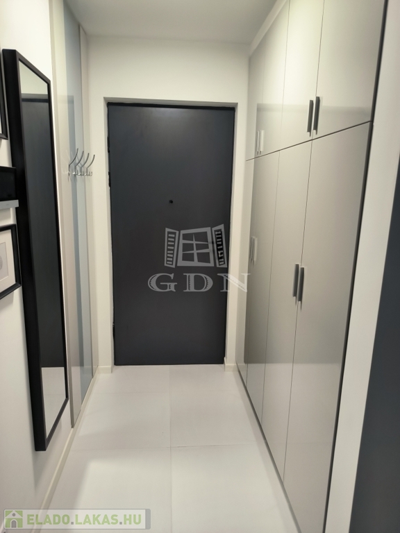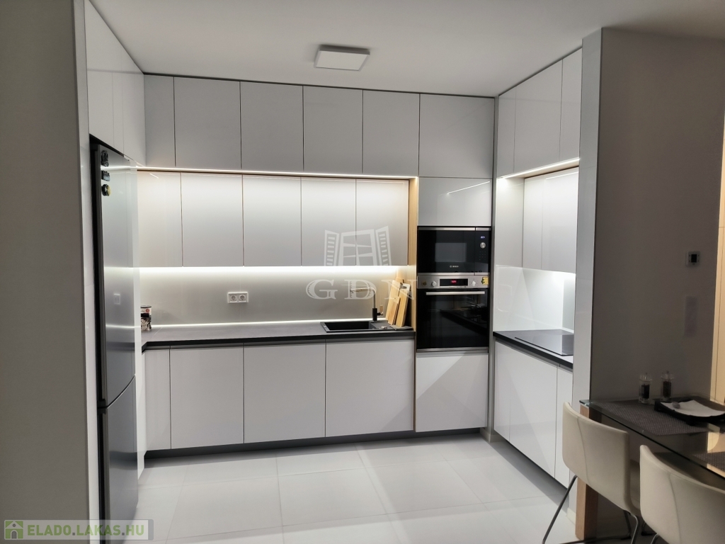 A lakásban az újszerű amerikai konyhás nappaliban beépített konyhabútor, az előszobában pedig előszobaszekrények találhatók, valamint fehér fényes, csillogó járólapok vannak ahonnét a nappaliból és a közlekedőből fürdőszoba és a WC nyílik .