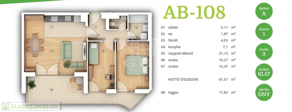 Ez a lakás nappali+2 hálós, 62nm alapterületű és tartozik hozzá egy 18nm-es terasz is.