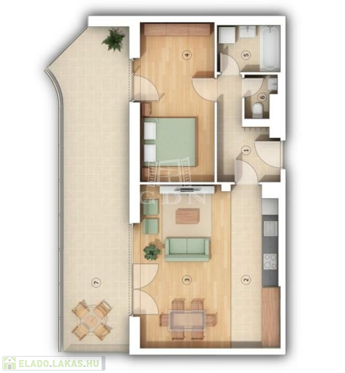 Ez a lakás nappali+1 hálós, 59nm alapterületű+ tartozik hozzá egy 29nm-es terasz is.