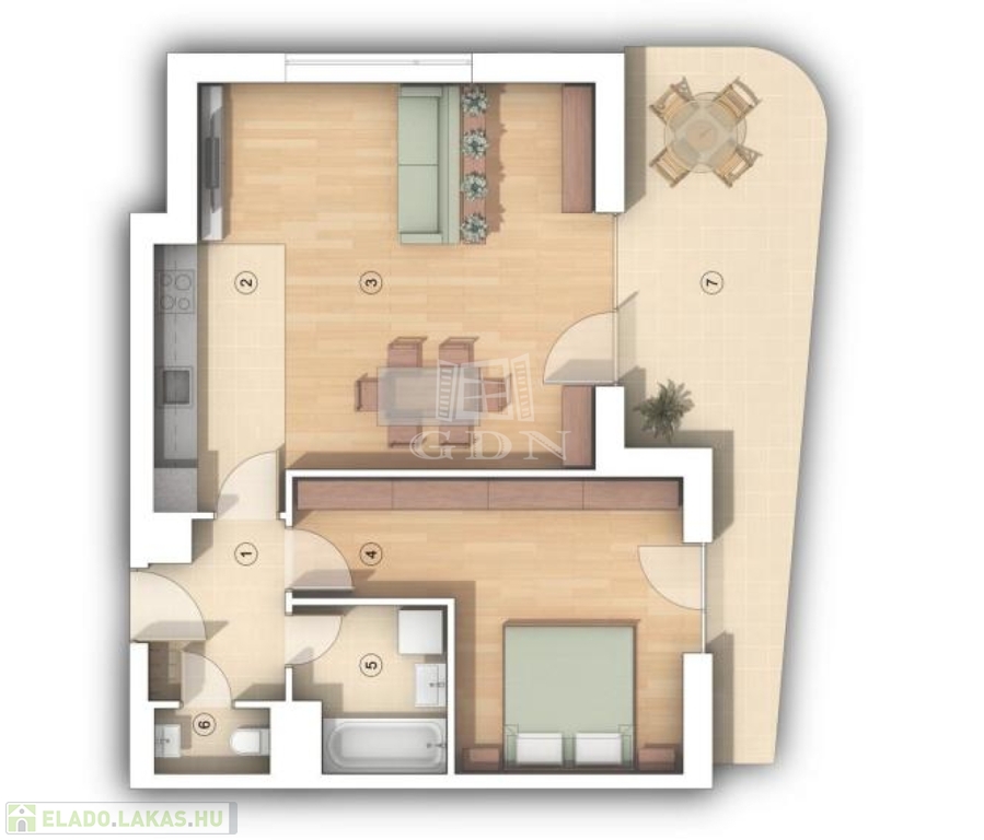 Ez a lakás nappali+1 hálós, 59nm alapterületű+ tartozik hozzá egy 19nm-es terasz is.