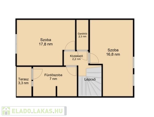 A felső szintre vezető lépcsőn a 2,2 nm-es közlekedőbe érkezünk, amiből jobbra nyílik a 16,8 nm-es laminált parkettás szoba, amit egy 2,3 nm-es jól kihasználható gardrób választ el a balra lévő 12,5 nm-es szintén laminált parkettás hálószobától.