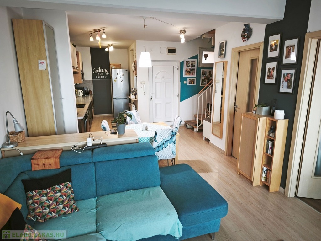 A lakás a biztonsági ráccsal ellátott folyosó végén helyezkedik el. A bejárattal szemben található egy saját 1,5 nm-es beépített külső tároló. A folyosó utolsó lakásaként a szintén biztonsági ráccsal védett bejárati ajtón belépve az alsó szinten a nagyon tágas 30 nm-es ízlésesen berendezett klímás, amerikai konyhás, nappaliba érkezünk, ami kényelmes teret biztosít a család mindennapi életéhez, közös időtöltéséhez. A konyha gépesített, ablakos , modern, bútorozott.