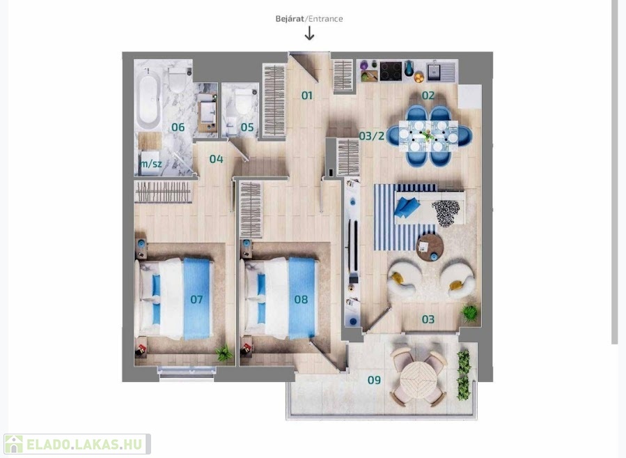 - Elrendezés: előszoba, konyha, nappali–étkező, közlekedő, WC, fürdőszoba, 2 hálószoba, erkély