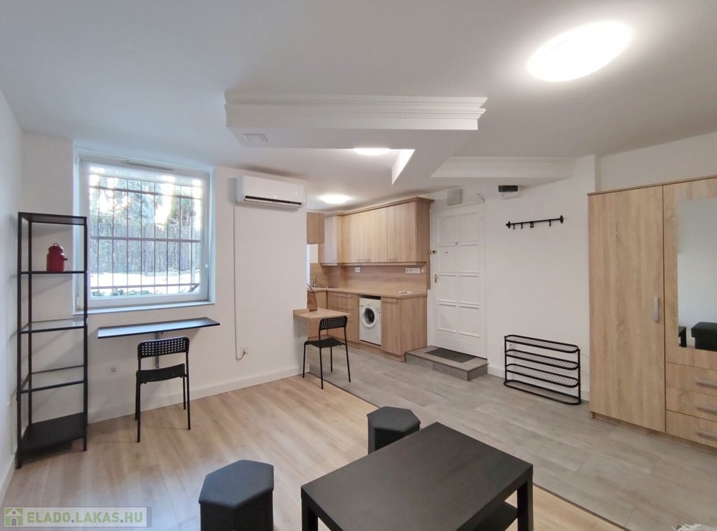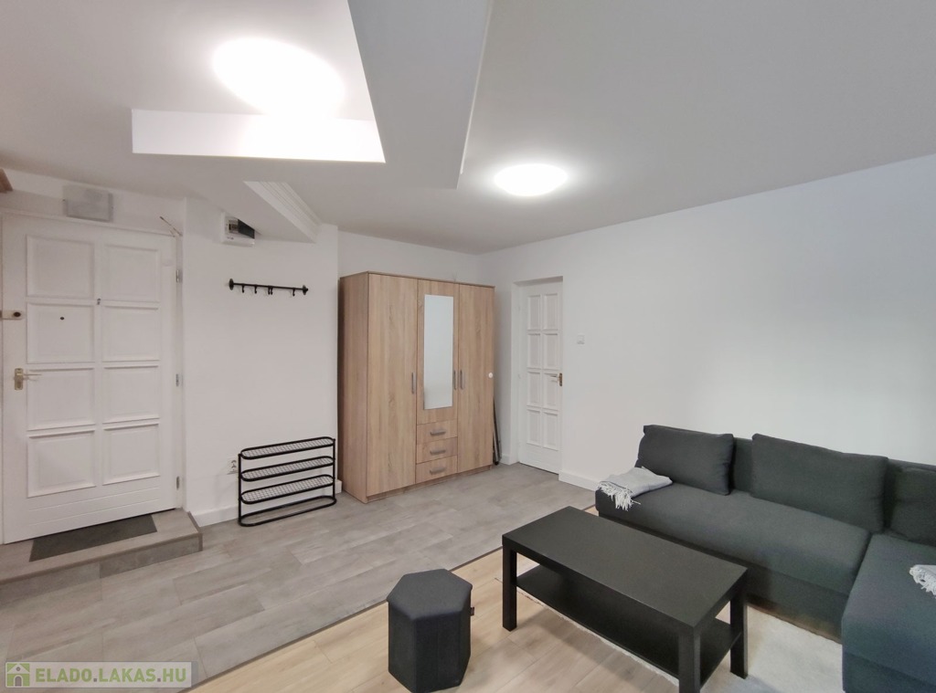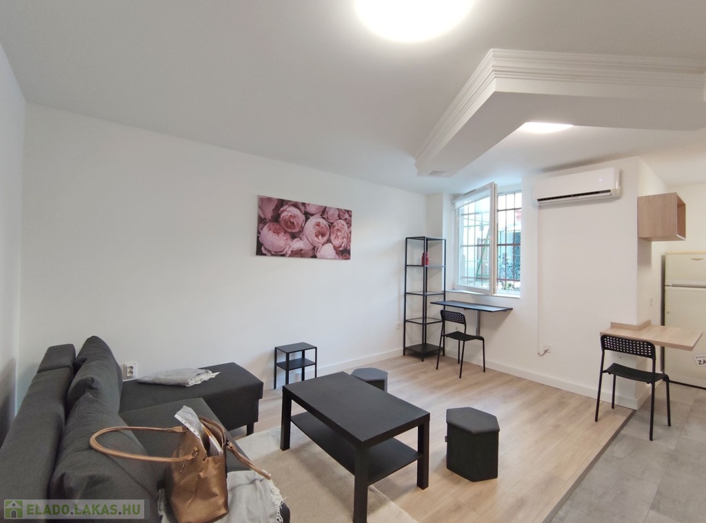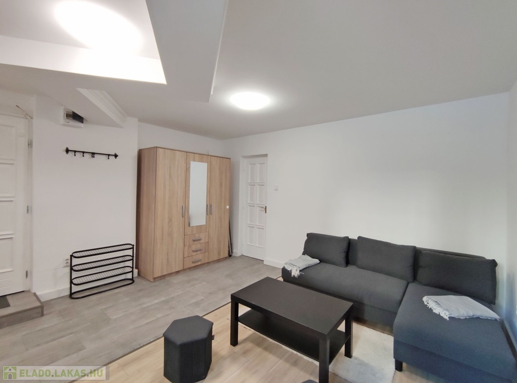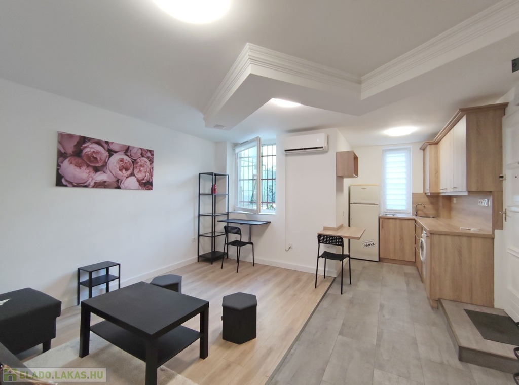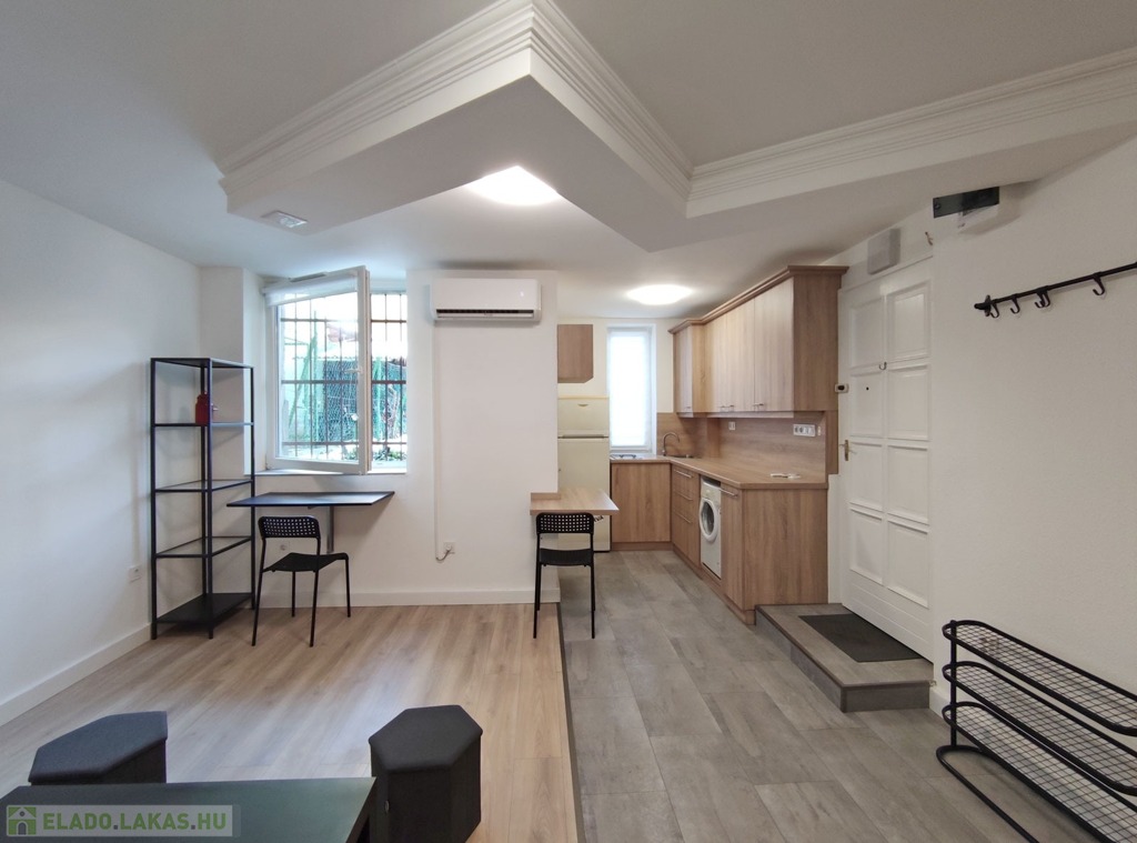 A földszintről lefelé hét lépcső vezet a lakásba, belépni a ráccsal ellátott, több ponton záródó biztonsági ajtón keresztül tudunk. A teljes körűen felújított, frissen festett, bútorozott tágas nappaliba lépünk be, amely részben járólappal , és parkettával burkolt, így növelve a kényelmet és a teret. Vele egy légtérben található, a gépesített elektromos tűzhellyel , mosogatógéppel ellátott bútorozott ablakos konyha. A szoba ablakából a körbekerített belső zöld udvarra látunk, amit jelenleg a házból nem használnak a lakók, ezért van lehetőség arra hogy grillezős, pihenős környezetté alakítsa az új lakó és reggelente a friss levegőn kávézhasson.
