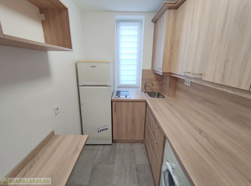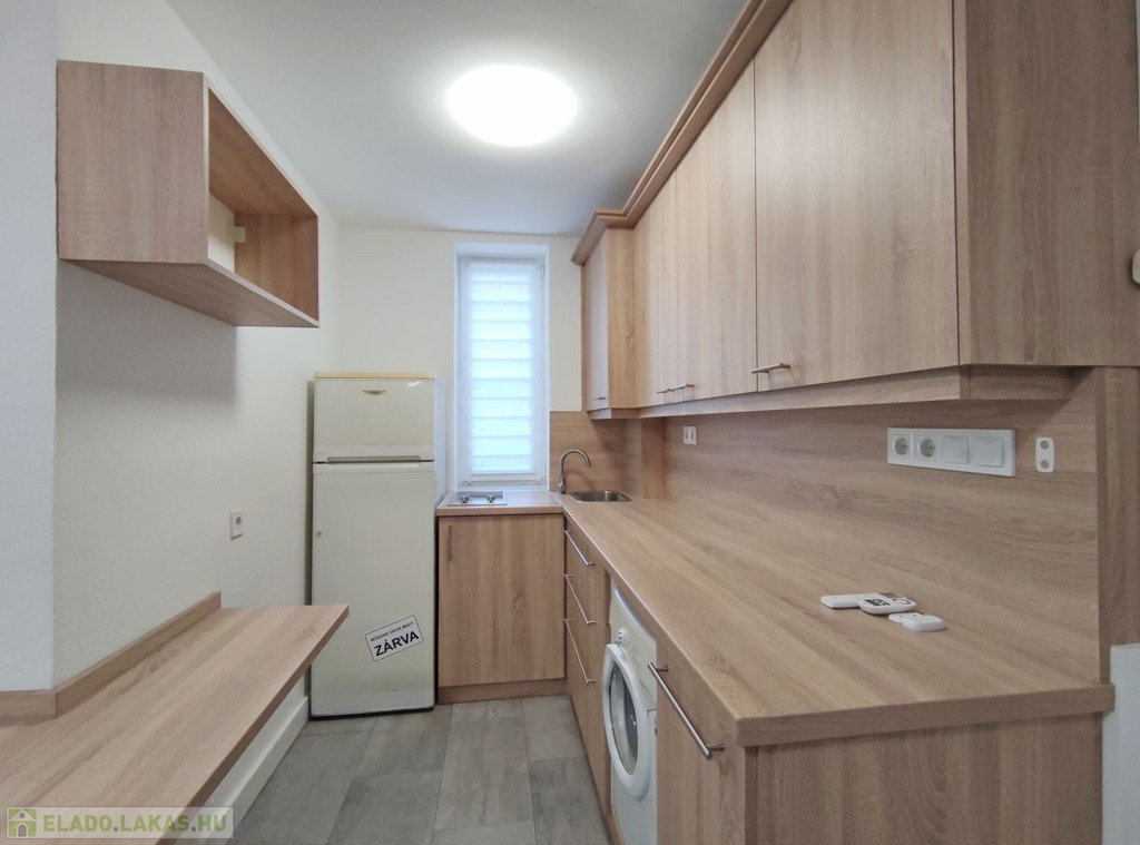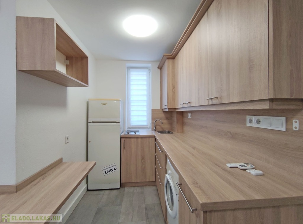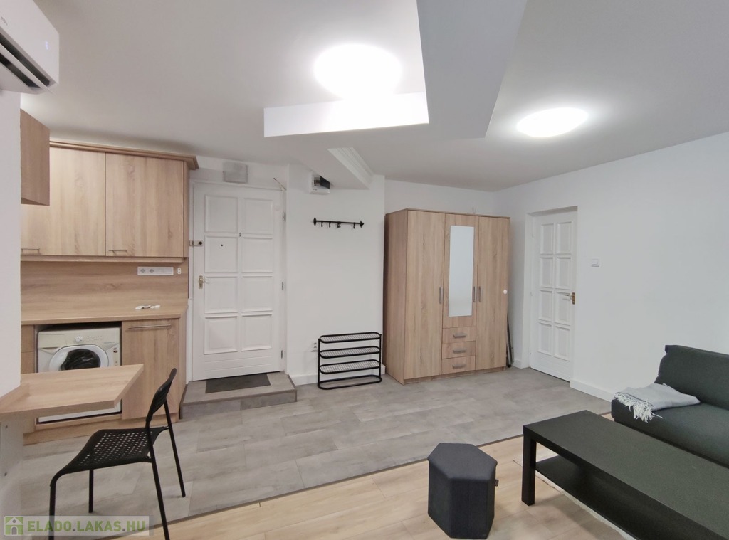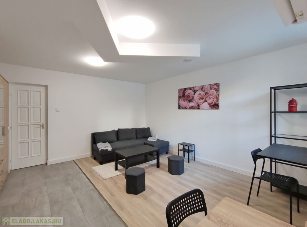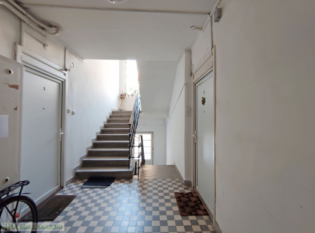 A földszintről lefelé hét lépcső vezet a lakásba, belépni a ráccsal ellátott, több ponton záródó biztonsági ajtón keresztül tudunk. A teljes körűen felújított, frissen festett, bútorozott tágas nappaliba lépünk be, amely részben járólappal , és parkettával burkolt, így növelve a kényelmet és a teret. Vele egy légtérben található, a gépesített elektromos tűzhellyel , mosogatógéppel ellátott bútorozott ablakos konyha. A szoba ablakából a körbekerített belső zöld udvarra látunk, amit jelenleg a házból nem használnak a lakók, ezért van lehetőség arra hogy grillezős, pihenős környezetté alakítsa az új lakó és reggelente a friss levegőn kávézhasson.
