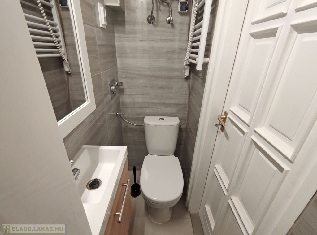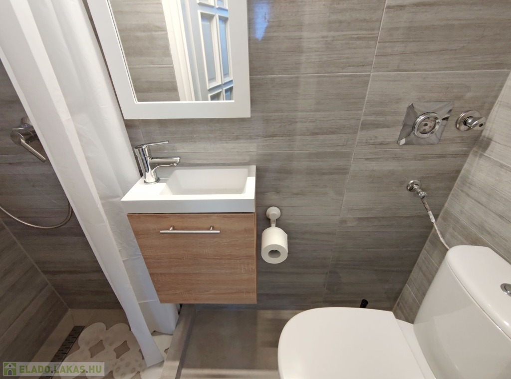 A nappaliból balra nyílik a szintén újonnan burkolt zuhanyzós kialakítású fürdő, itt kapott helyet a WC -is.