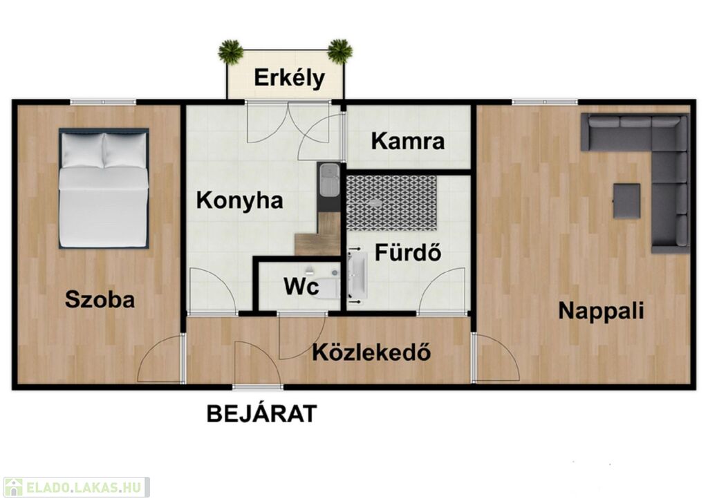 -48nm-es lakás(konyha, nappali, 1 lakószoba, fürdőszoba, kamra és egy különálló wc)
