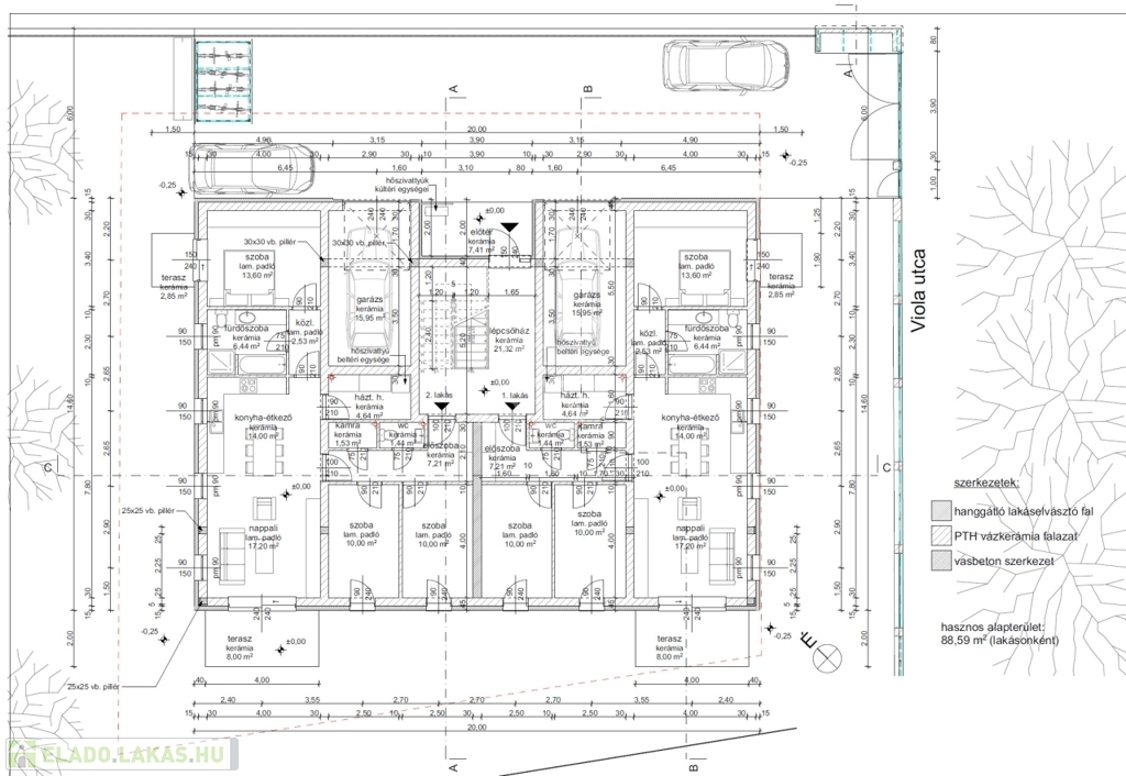 -Lakás alapterület:88,6 m² + garázs 16 m² + teraszok 8 m² és 2,85 m²