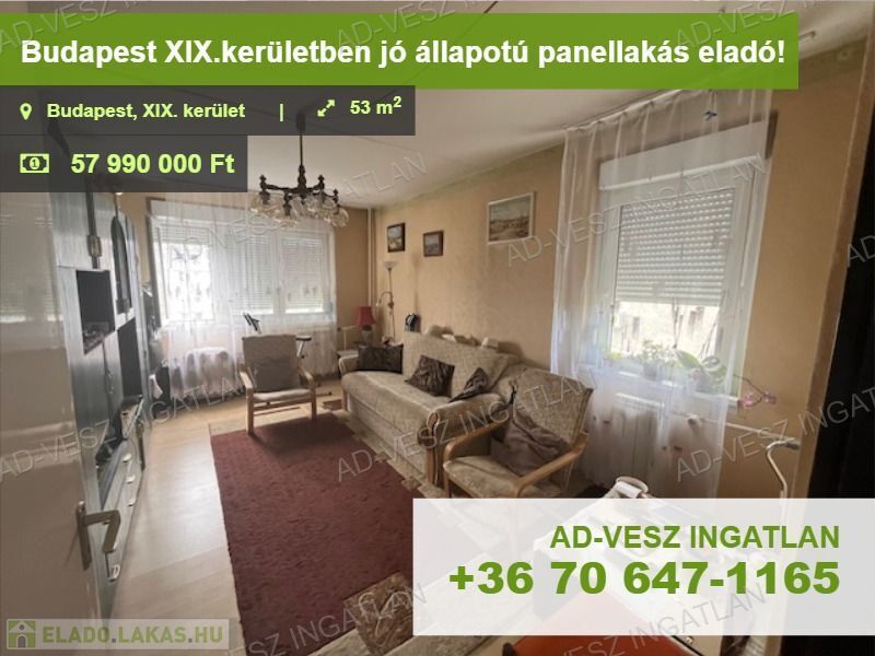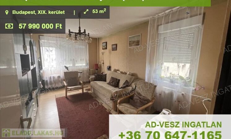 ELADÓ Budapest XIX. kerületének közkedvelt, zöldövezeti részén, az Arany János utcában egy jó állapotú, 9.emeleti, szélső, 53m2-es panellakás, liftes, alacsony fenntartási költségekkel.