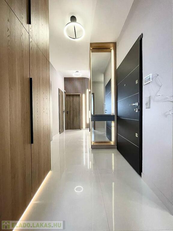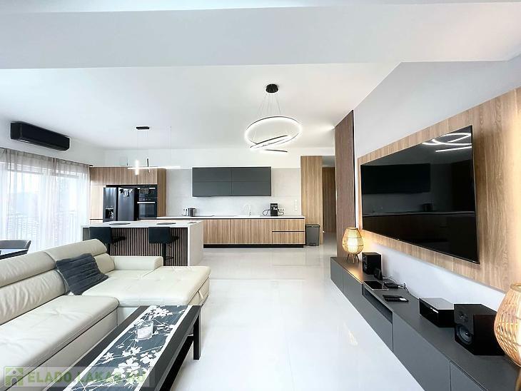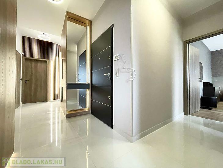 A lakásban egy 44 m2-es amerikai konyhás, étkezős nappali, 3 szoba, 2 fürdőszoba, előtér, közlekedő, mellékhelyiség és 2 terasz található (7 m2+ 23 m2). Gyönyörű, egyedi, minőségi burkolatok lettek beszerelve.
