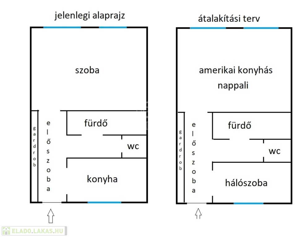 A konyha áthelyezésével egy amerikai konyhás nappali és egy hálószoba könnyedén kialakítható!